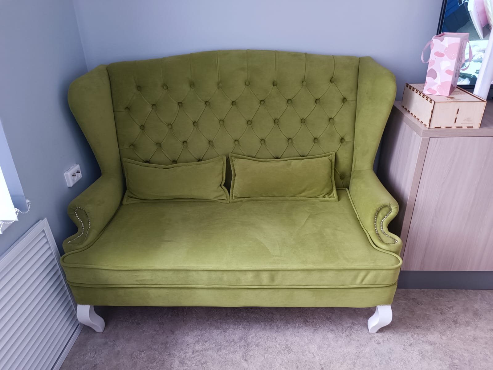 Диван удобный, красивый. Сидишь , как на троне. А главное он смотрится очень эффектно. Прекрасно подошёл для нашего рецепшен !